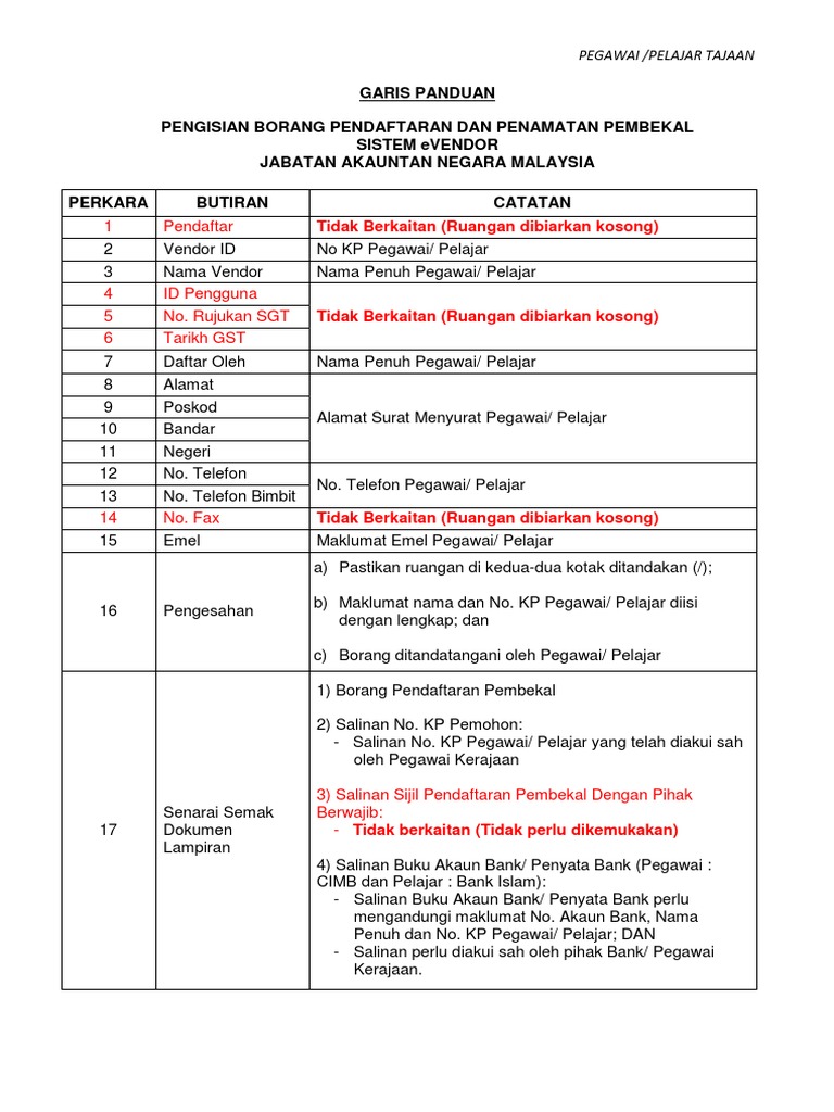Garis Panduan Pengisian Borang Pendaftaran Dan Penamatan Pembekal Sistem Evendor Pegawai Pelajar Tajaan Jpa Pdf